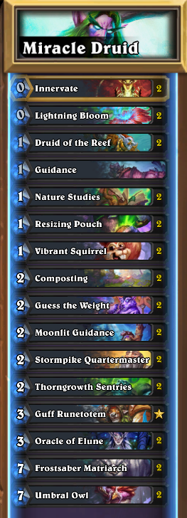 This Druid deck is an aggro-combo deck that is fully designed around casting a critical mass of cheap and free spells to take advantage of Guff Runetotem and Stormpike Quartermaster. Oracle of Elune can then double all of these buffs, letting us pump out a massive board all in one turn.
